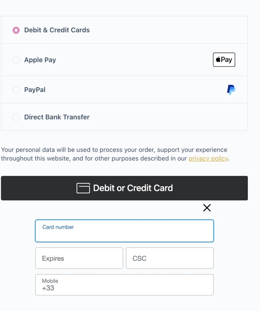 Besides the PayPal Checkout button, our site also enables the Debit or Credit Card button for direct card payment.